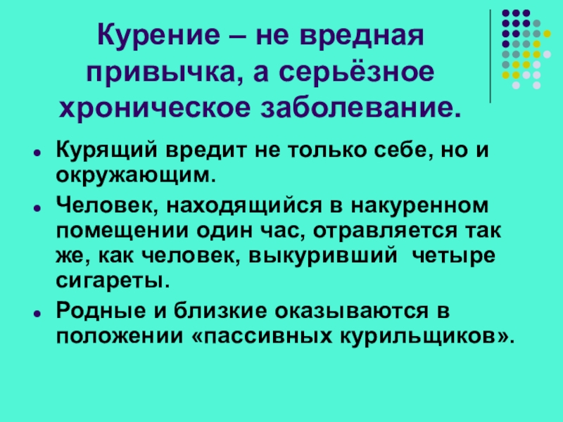 Курение – не вредная привычка, а серьёзное хроническое заболевание.Курящий вредит не только себе, но и окружающим.Человек, находящийся