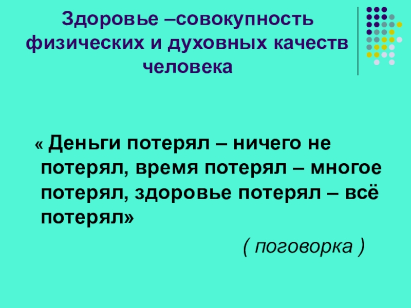 Здоровье –совокупность физических и духовных качеств человека « Деньги потерял – ничего не потерял, время потерял –