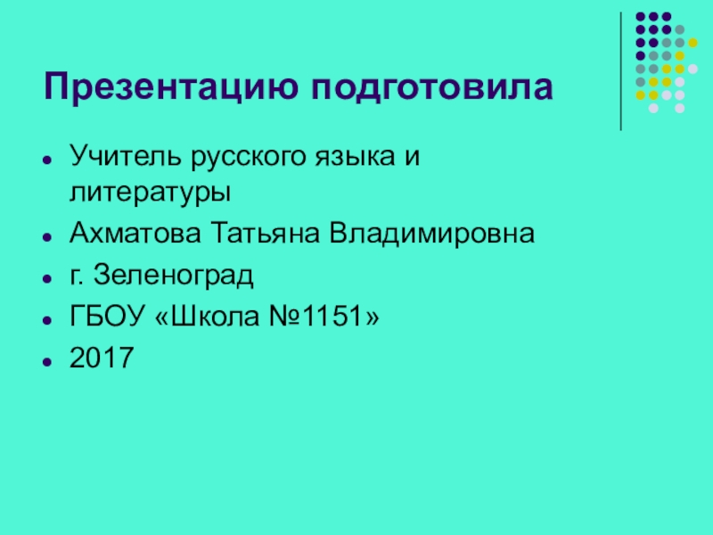 Презентацию подготовилаУчитель русского языка и литературыАхматова Татьяна Владимировнаг. ЗеленоградГБОУ «Школа №1151»2017