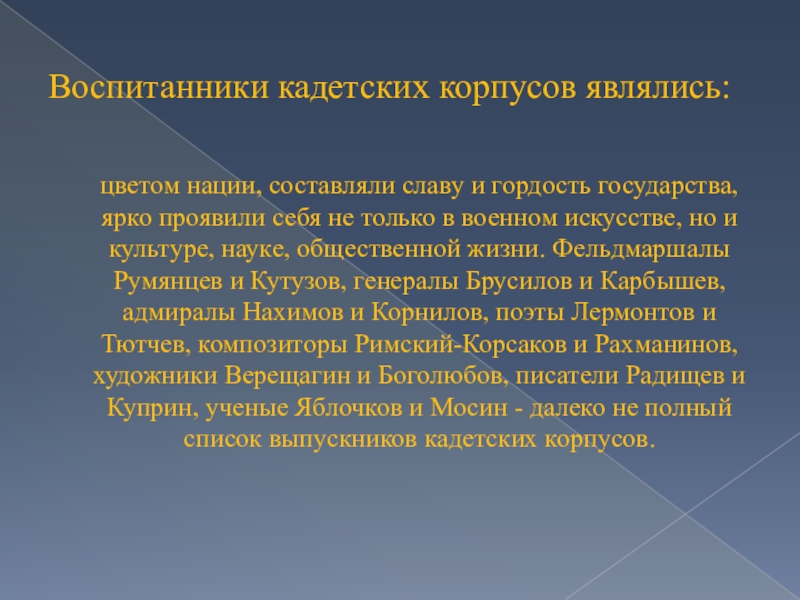 гордость государства, ярко проявили себя не только в военном искусстве, но и культуре, науке, общественной жизни. Фельдмаршалы Румянцев и Кутузов, генералы Брусилов и Карбышев, адмиралы Нахимов и Корнилов, поэты Лермонтов и Тютчев, композиторы Римский-Корсаков и Рахманинов, художники Верещагин и Боголюбов, писатели Радищев и Куприн, ученые Яблочков и Мосин - далеко не полный список выпускников кадетских корпусов.