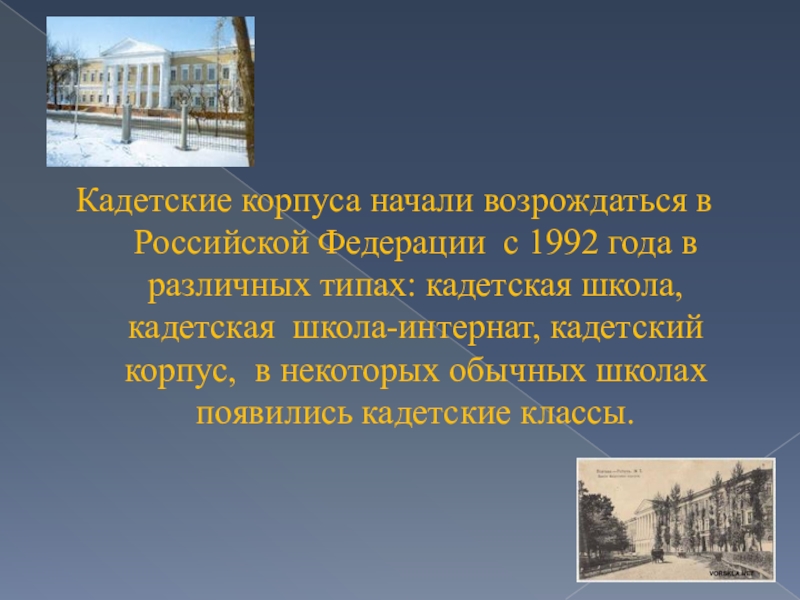 Слайд 5Кадетские корпуса начали возрождаться в Российской Федерации с 1992 года в