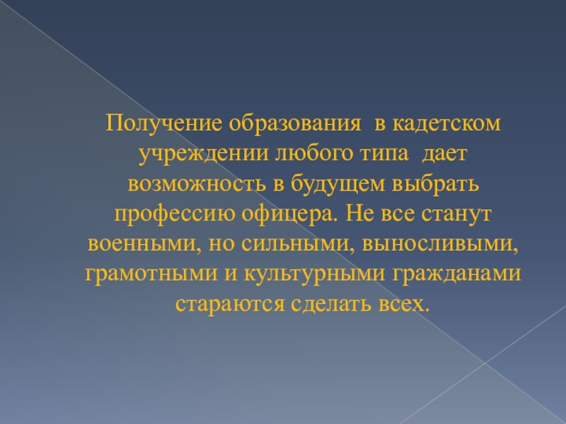 выбрать профессию офицера. Не все станут военными, но сильными, выносливыми, грамотными и культурными гражданами стараются сделать всех.