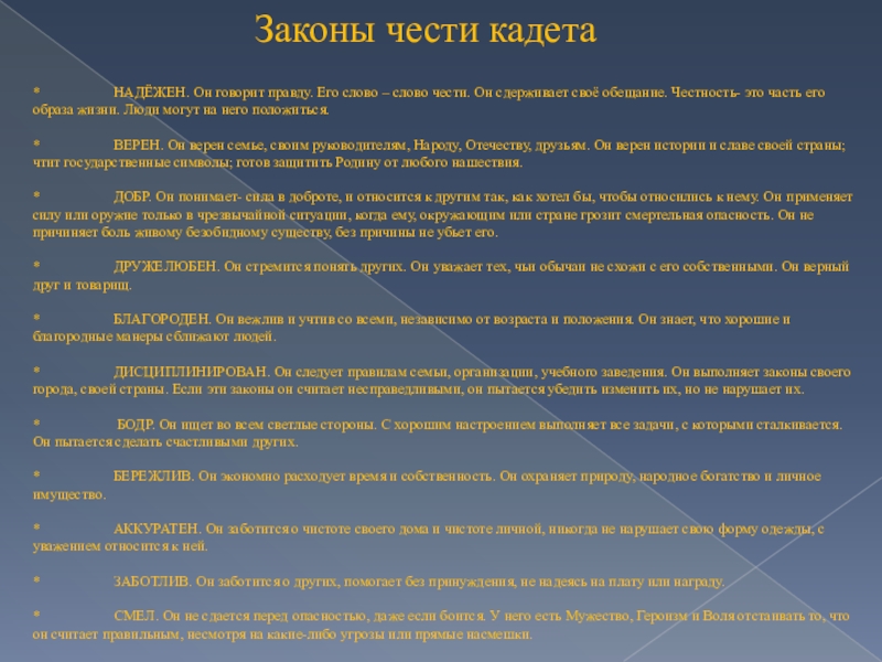 * ВЕРЕН. Он верен семье, своим руководителям, Народу, Отечеству, друзьям. Он верен истории и славе своей страны; чтит государственные символы; готов защитить Родину от любого нашествия.