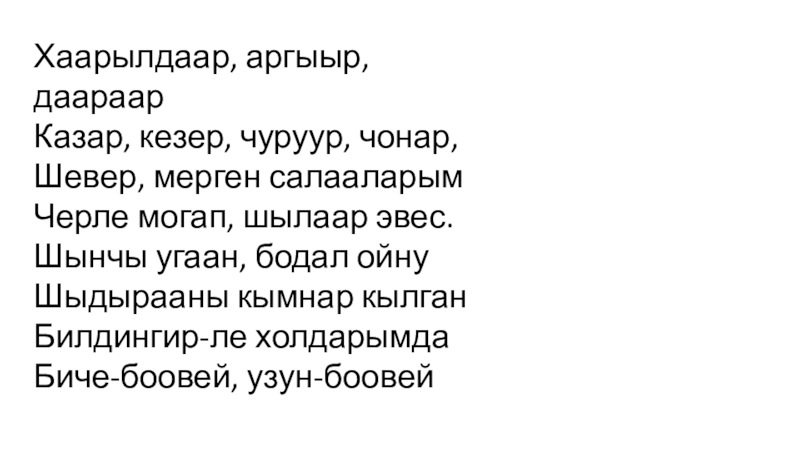 Хаарылдаар, аргыыр, даараарКазар, кезер, чуруур, чонар,Шевер, мерген салааларымЧерле могап, шылаар эвес.Шынчы угаан, бодал ойнуШыдырааны кымнар кылганБилдингир-ле холдарымдаБиче-боовей,