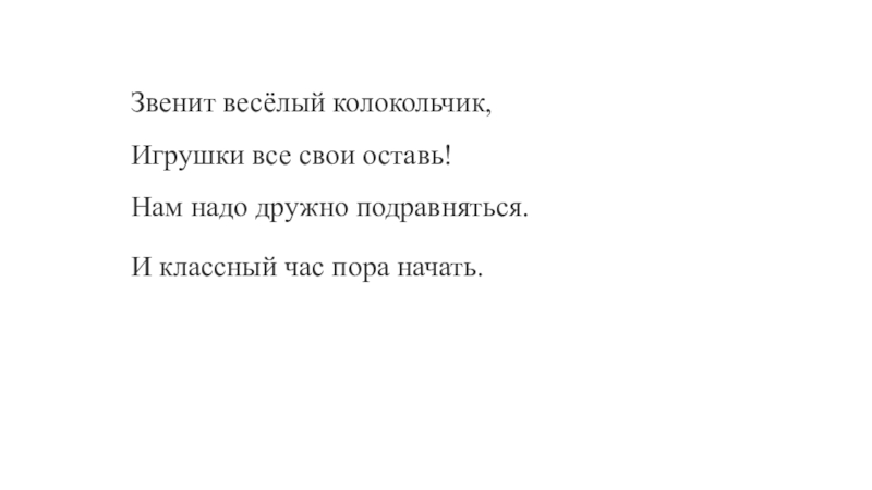 Звенит весёлый колокольчик, Игрушки все свои оставь! Нам надо дружно подравняться.И классный час пора начать.