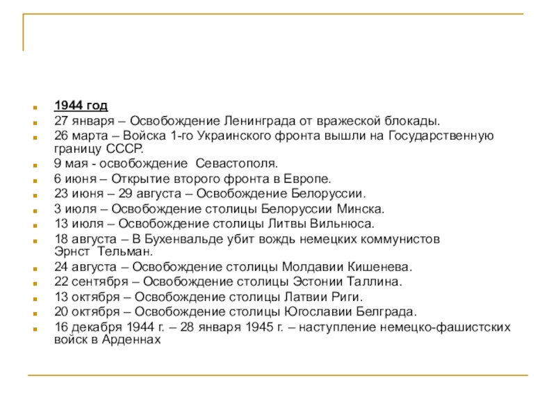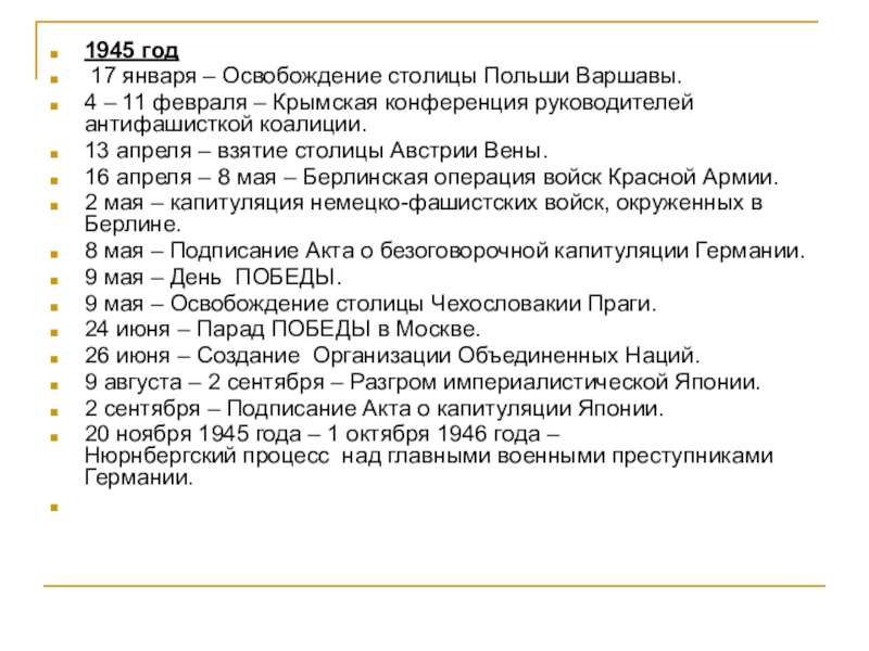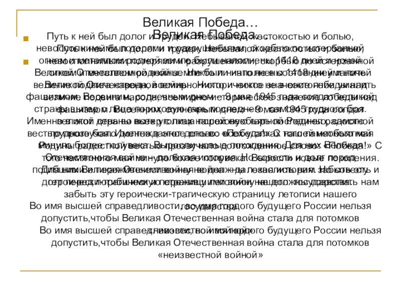 Путь к ней был долог и труден. Небывалой жестокостью и болью, невосполнимыми потерями и разрушениями, скорбью по истерзанной огнем и металлом родной земле были наполнены 1418 дней и ночей Великой Отечественной войны. Никто и ничто не в состоянии умалить величие подвига народа, всемирно-историческое значение победы над фашизмом. Весенним, солнечным днем – 9 мая 1945 года солдат великой страны вытер с лица пороховую гарь последнего, самого трудного боя. Именно в этот день во всех уголках нашей необъятной Родины радостной вестью прозвучало долгожданное слово: «Победа!» С того памятного мая минуло более полувека. Выросли новые поколения. Для них Великая Отечественная война – далекая история. Но совесть и долг перед погибшими и пережившими войну не должны позволить нам забыть эту героически-трагическую страницу летописи нашего государства.