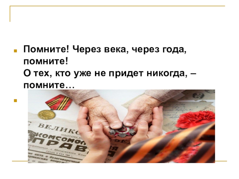 Во имя высшей справедливости, во имя гордого будущего России нельзя допустить,чтобы Великая Отечественная война стала для потомков «неизвестной войной»