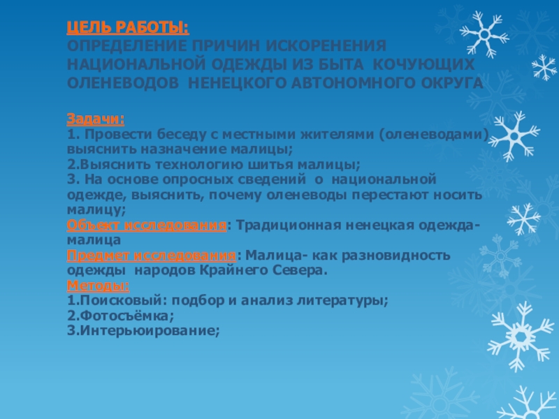 Предмет исследования: Малица- как разновидность одежды народов Крайнего Севера.
