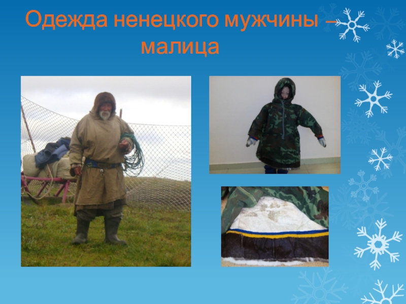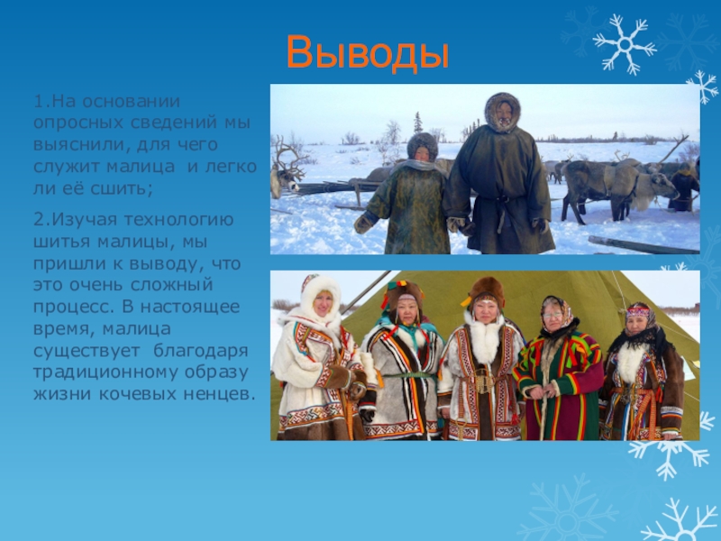 1. Провести беседу с местными жителями (оленеводами) выяснить назначение малицы;