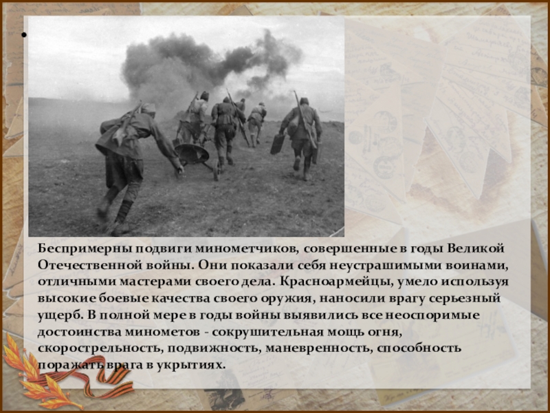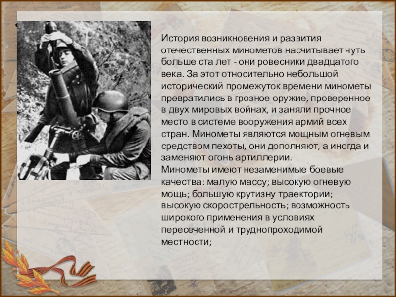 Великой Отечественной войны. Они показали себя неустрашимыми воинами, отличными мастерами своего дела. Красноармейцы, умело используя высокие боевые качества своего оружия, наносили врагу серьезный ущерб. В полной мере в годы войны выявились все неоспоримые достоинства минометов - сокрушительная мощь огня, скорострельность, подвижность, маневренность, способность поражать врага в укрытиях.