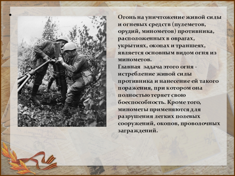 огневых средств (пулеметов, орудий, минометов) противника, расположенных в оврагах, укрытиях, окопах и траншеях, является основным видом огня из минометов.