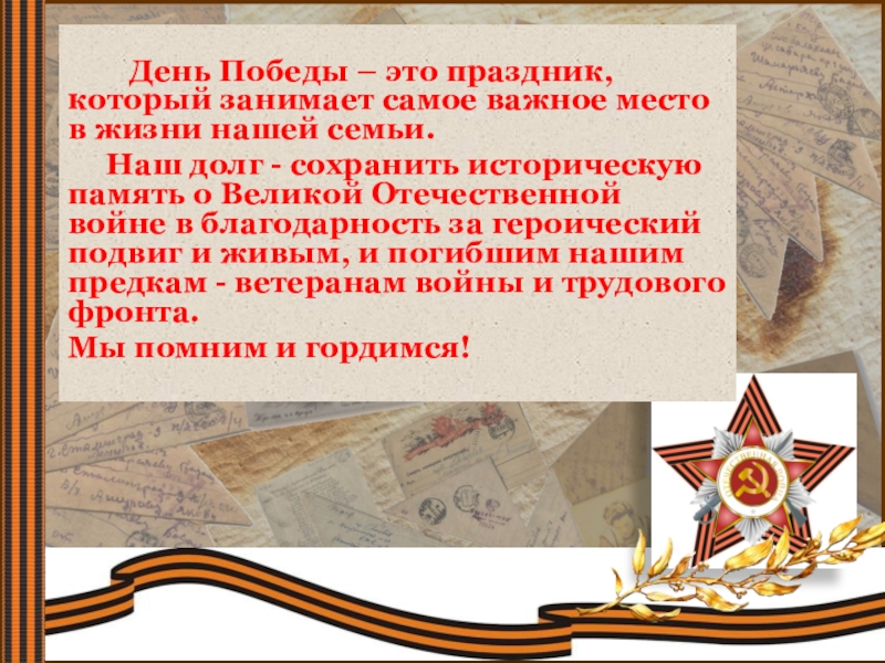 День Победы – это праздник, который занимает самое важное место в жизни нашей семьи.
