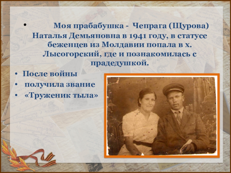 Демьяновна в 1941 году, в статусе беженцев из Молдавии попала в х. Лысогорский, где и познакомилась с прадедушкой.