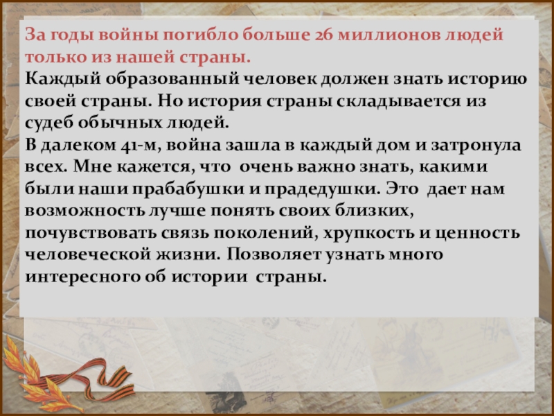 Слайд 3За годы войны погибло больше 26 миллионов людей только из нашей