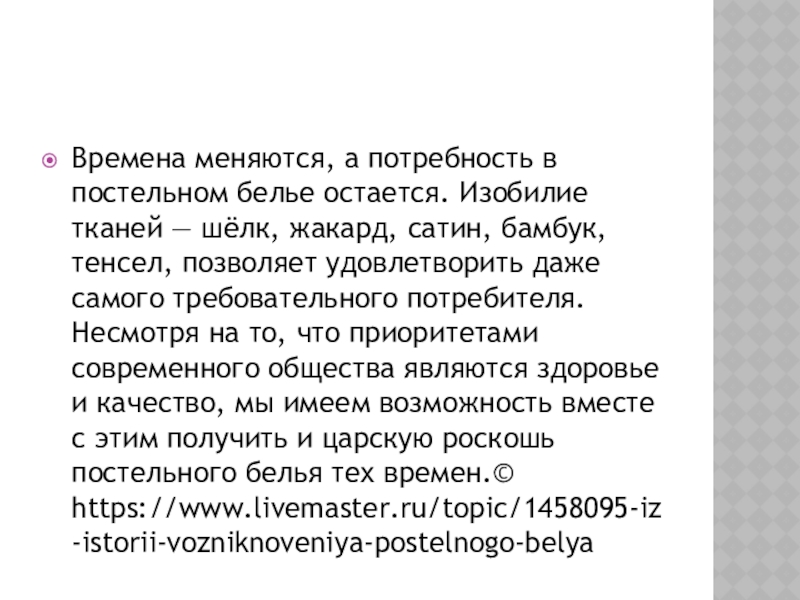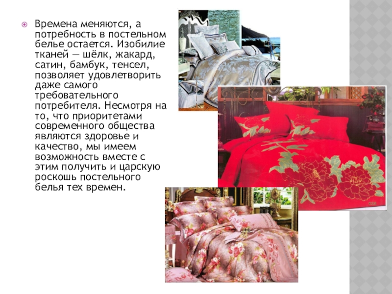Слайд 13Времена меняются, а потребность в постельном белье остается. Изобилие тканей — шёлк,