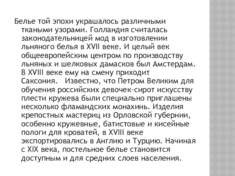 в изготовлении льняного белья в XVII веке. И целый век общеевропейским центром по производству льняных и шелковых дамасков был Амстердам. В XVIII веке ему на смену приходит Саксония. Известно, что Петром Великим для обучения российских девочек-сирот искусству плести кружева были специально приглашены несколько фламандских монахинь. Изделия крепостных мастериц из Орловской губернии, особенно кружевные, батистовые и кисейные пологи для кроватей, в XVIII веке экспортировались в Англию и Турцию. Начиная с XIX века, постельное белье становится доступным и для средних слоев населения.
