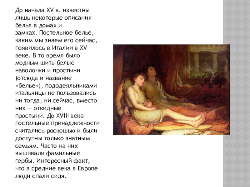и замках. Постельное белье, каким мы знаем его сейчас, появилось в Италии в XV веке. В то время было модным шить белые наволочки и простыни (отсюда и название «белье»), пододеяльниками итальянцы не пользовались ни тогда, ни сейчас, вместо них — откидные простыни. До XVIII века постельные принадлежности считались роскошью и были доступны только знатным семьям. Часто на них вышивали фамильные гербы. Интересный факт, что в средние века в Европе люди спали сидя.