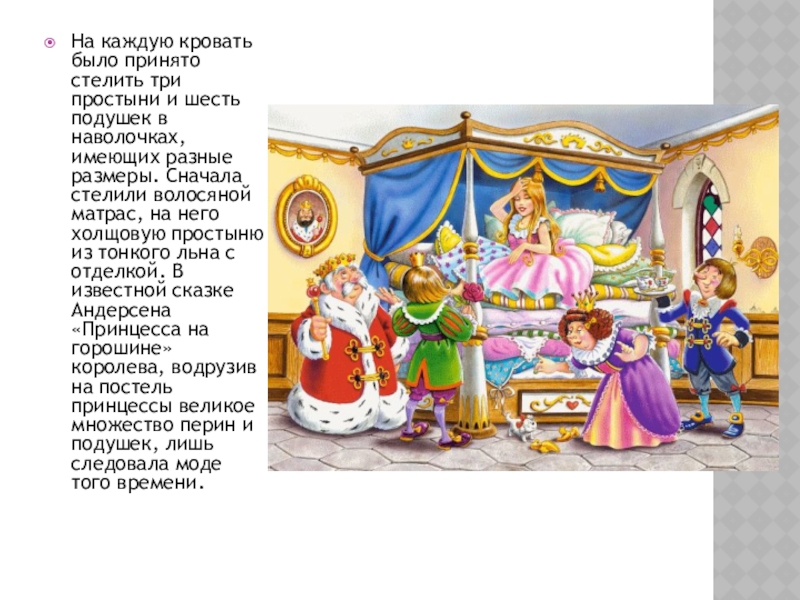 в наволочках, имеющих разные размеры. Сначала стелили волосяной матрас, на него холщовую простыню из тонкого льна с отделкой. В известной сказке Андерсена «Принцесса на горошине» королева, водрузив на постель принцессы великое множество перин и подушек, лишь следовала моде того времени.