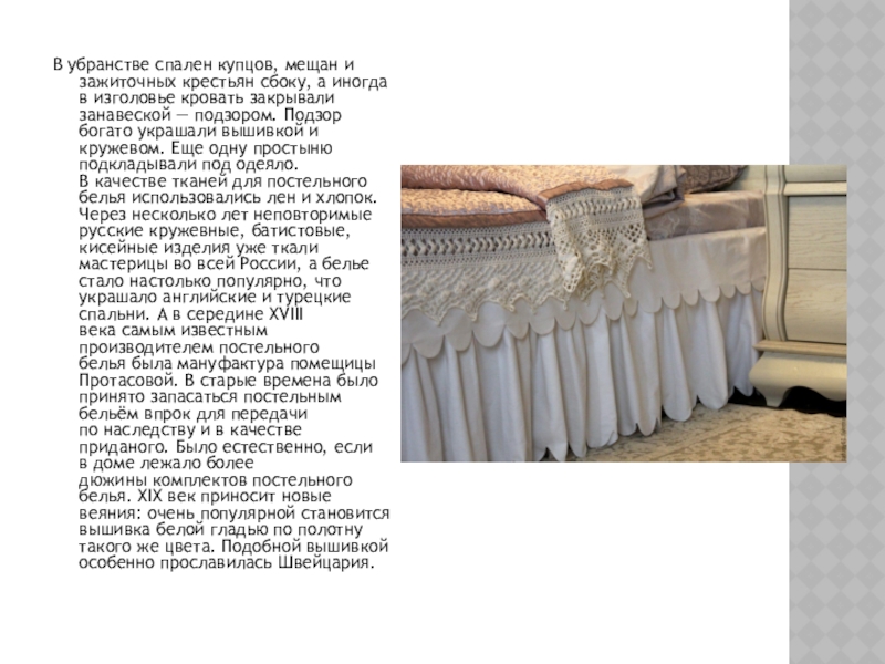 в изголовье кровать закрывали занавеской — подзором. Подзор богато украшали вышивкой и кружевом. Еще одну простыню подкладывали под одеяло. В качестве тканей для постельного белья использовались лен и хлопок. Через несколько лет неповторимые русские кружевные, батистовые, кисейные изделия уже ткали мастерицы во всей России, а белье стало настолько популярно, что украшало английские и турецкие спальни. А в середине XVIII века самым известным производителем постельного белья была мануфактура помещицы Протасовой. В старые времена было принято запасаться постельным бельём впрок для передачи по наследству и в качестве приданого. Было естественно, если в доме лежало более дюжины комплектов постельного белья. XIX век приносит новые веяния: очень популярной становится вышивка белой гладью по полотну такого же цвета. Подобной вышивкой особенно прославилась Швейцария.