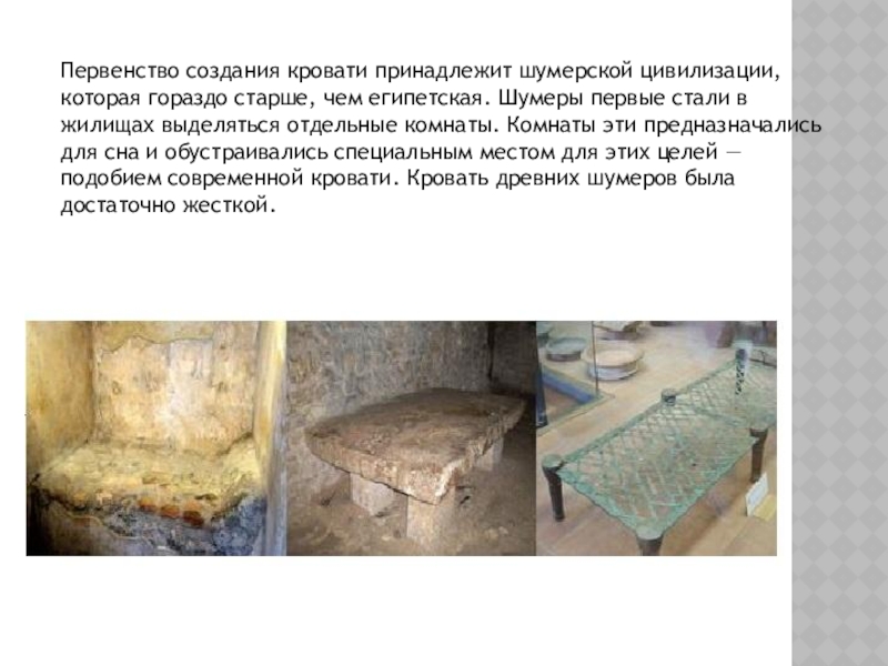 Слайд 5Первенство создания кровати принадлежит шумерской цивилизации, которая гораздо старше, чем египетская. Шумеры