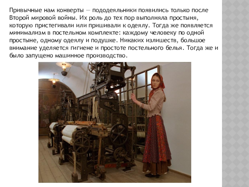 Слайд 12Привычные нам конверты — пододеяльники появились только после Второй мировой войны.