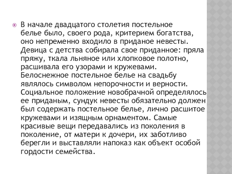 Слайд 11В начале двадцатого столетия постельное белье было, своего рода, критерием богатства, оно непременно