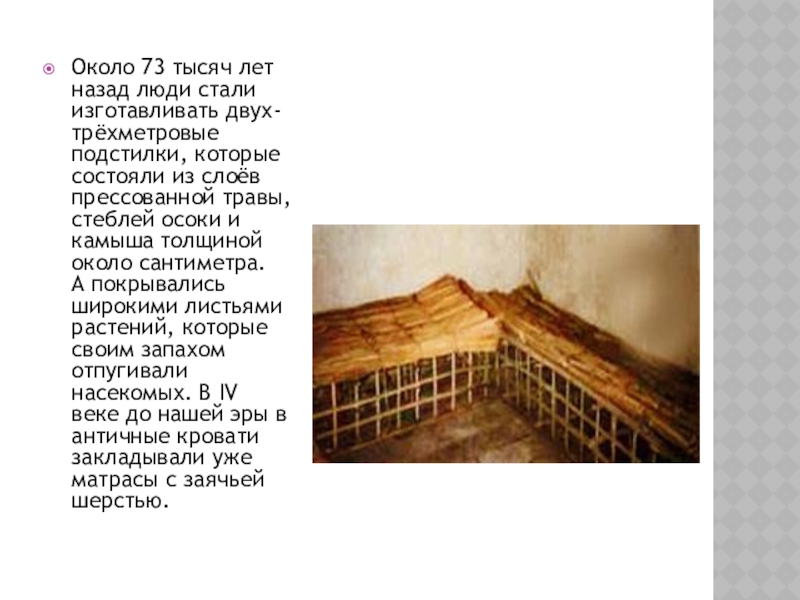 Слайд 4Около 73 тысяч лет назад люди стали изготавливать двух-трёхметровые подстилки, которые