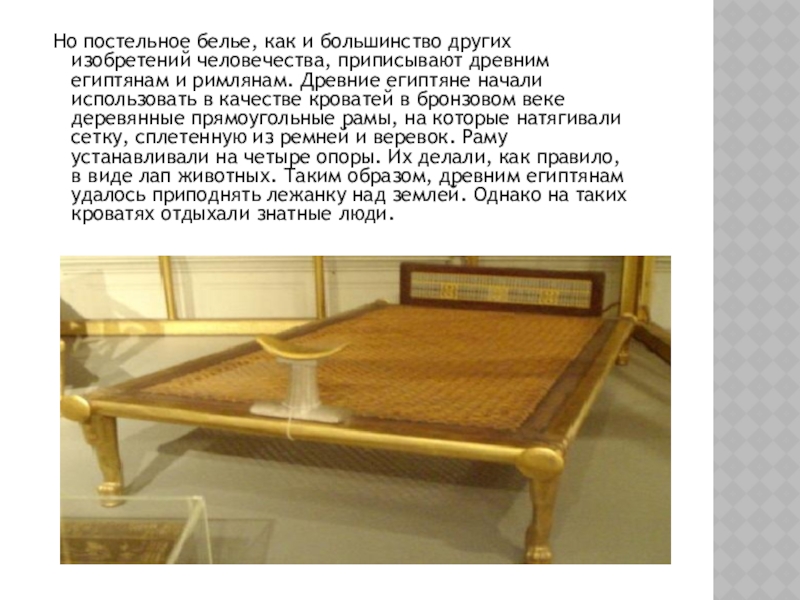 древним египтянам и римлянам. Древние египтяне начали использовать в качестве кроватей в бронзовом веке деревянные прямоугольные рамы, на которые натягивали сетку, сплетенную из ремней и веревок. Раму устанавливали на четыре опоры. Их делали, как правило, в виде лап животных. Таким образом, древним египтянам удалось приподнять лежанку над землей. Однако на таких кроватях отдыхали знатные люди.