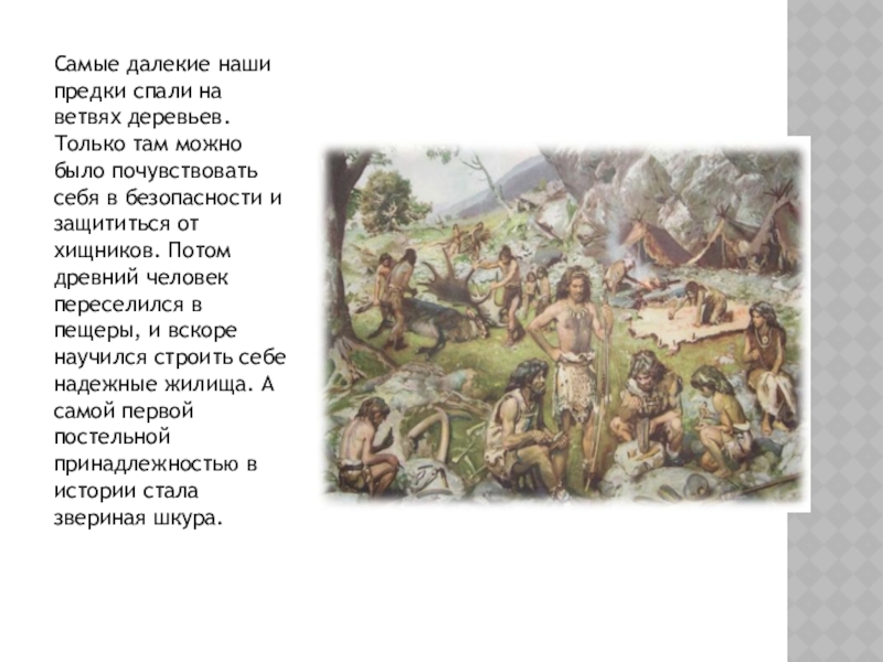 Слайд 3Самые далекие наши предки спали на ветвях деревьев. Только там можно