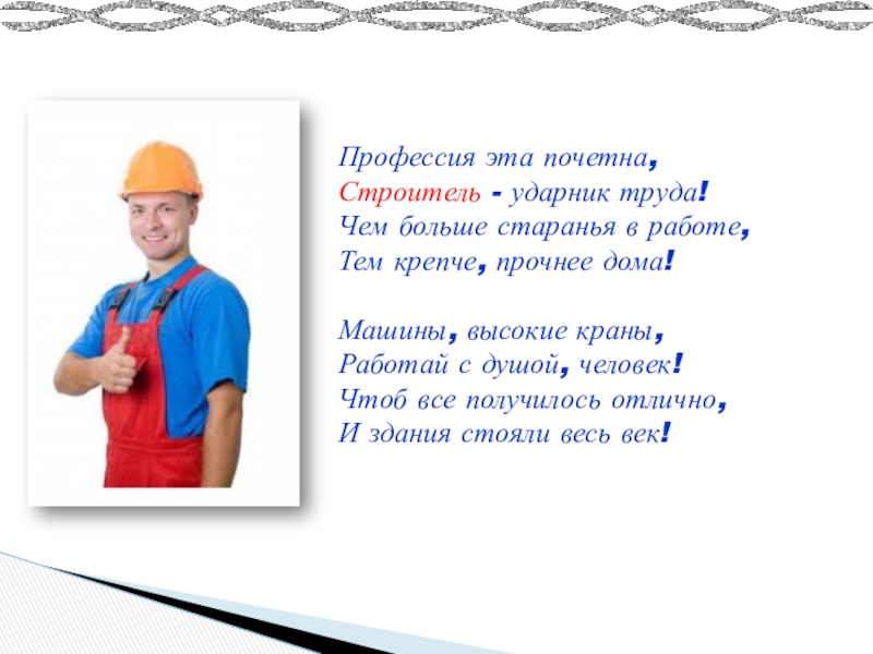 Слайд 2Профессия эта почетна, Строитель - ударник труда! Чем больше старанья в работе, Тем крепче,