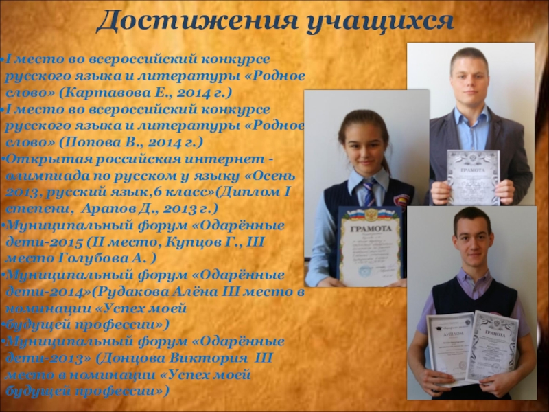 Это сайт презентаций, где можно хранить и обмениваться своими презентациями, докладами, проектами, шаблонами в формате PowerPoint с другими пользователями. Мы помогаем школьникам, студентам, учителям, преподавателям хранить и обмениваться учебными материалами.