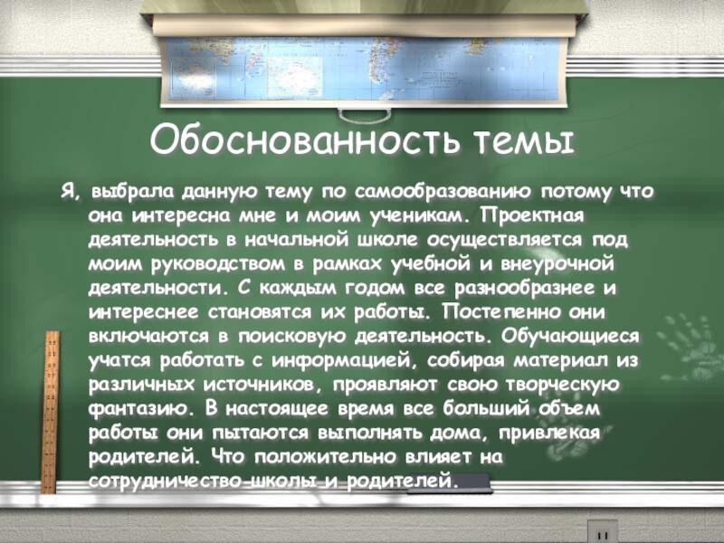 мне и моим ученикам. Проектная деятельность в начальной школе осуществляется под моим руководством в рамках учебной и внеурочной деятельности. С каждым годом все разнообразнее и интереснее становятся их работы. Постепенно они включаются в поисковую деятельность. Обучающиеся учатся работать с информацией, собирая материал из различных источников, проявляют свою творческую фантазию. В настоящее время все больший объем работы они пытаются выполнять дома, привлекая родителей. Что положительно влияет на сотрудничество школы и родителей.