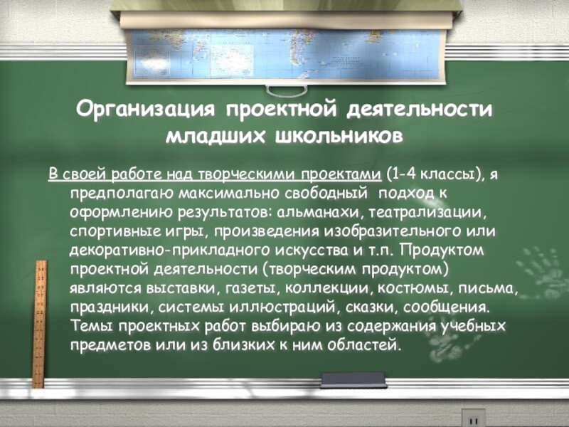 классы), я предполагаю максимально свободный подход к оформлению результатов: альманахи, театрализации, спортивные игры, произведения изобразительного или декоративно-прикладного искусства и т.п. Продуктом проектной деятельности (творческим продуктом) являются выставки, газеты, коллекции, костюмы, письма, праздники, системы иллюстраций, сказки, сообщения. Темы проектных работ выбираю из содержания учебных предметов или из близких к ним областей.