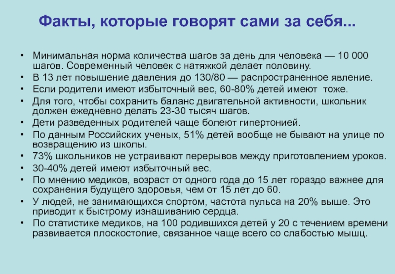 За прошлое столетие, по мнению ученых, вес непосредственной мышечной работы человека снизился с 94 до I процента. Главными пороками XXI века становятся: накапливание отрицательных эмоций без физической разрядки, переедание и гиподинамия.