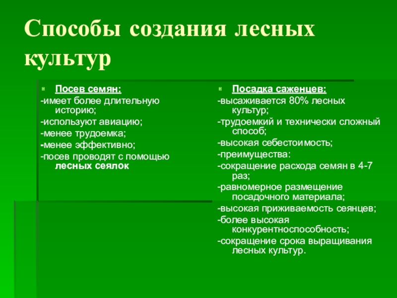 В 1946 г. после организации лесхозов началось регулярное увеличение объемов лесных культур. Площадь создаваемых культур увеличилась в 15 раз (аэросев).