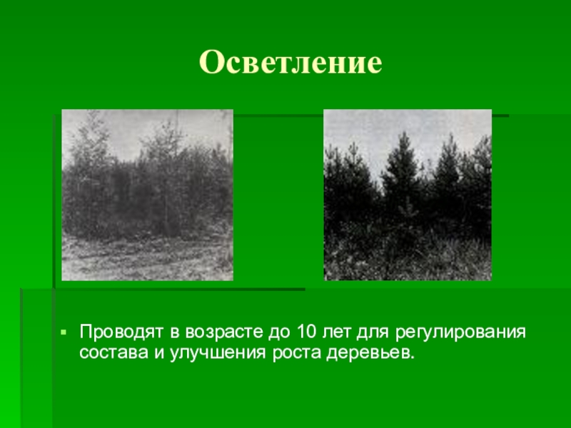 Проводят в средневозрастных древостоях для правильного формирования ствола и кроны.