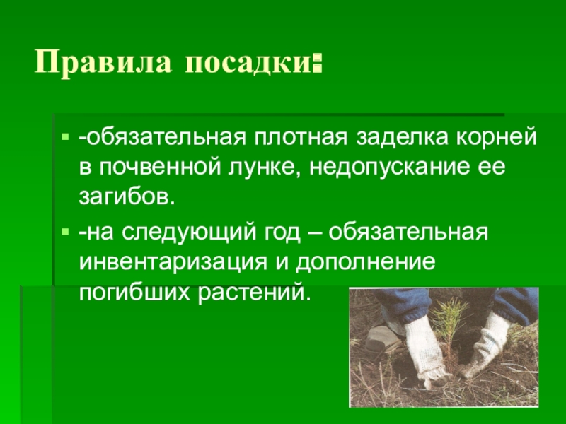 -обязательная плотная заделка корней в почвенной лунке, недопускание ее загибов.