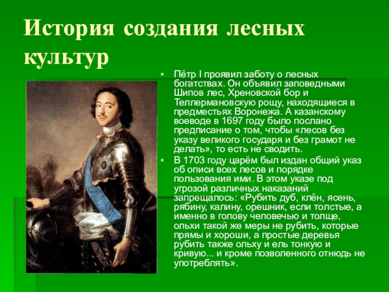 объявил заповедными Шипов лес, Хреновской бор и Теллермановскую рощу, находящиеся в предместьях Воронежа. А казанскому воеводе в 1697 году было послано предписание о том, чтобы «лесов без указу великого государя и без грамот не делать», то есть не сводить.