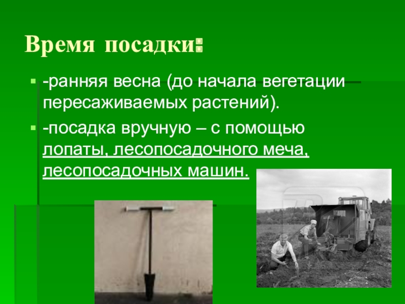 помощью лопаты, лесопосадочного меча, лесопосадочных машин.