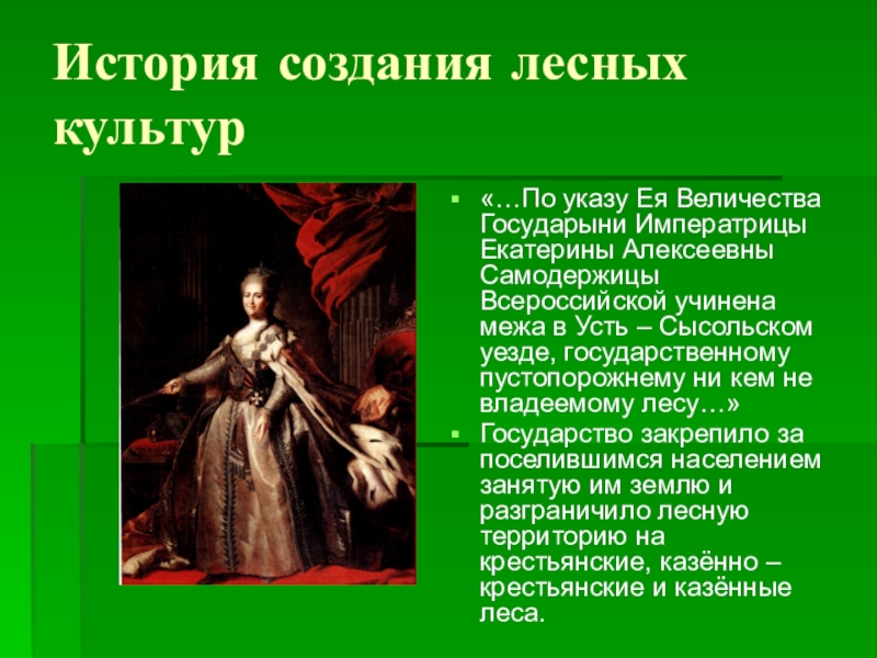 Государство закрепило за поселившимся населением занятую им землю и разграничило лесную территорию на крестьянские, казённо – крестьянские и казённые леса.