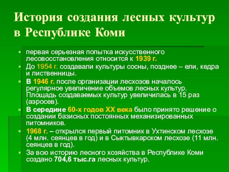1968 г. – открылся первый питомник в Ухтинском лесхозе (4 млн. сеянцев в год) и в Сыктывкарском лесхозе (11 млн. сеянцев в год).