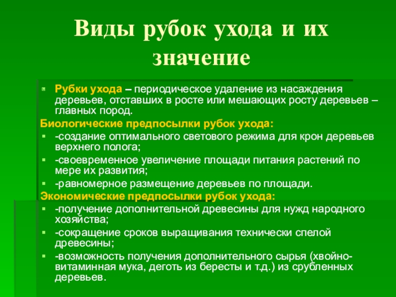 -возможность получения дополнительного сырья (хвойно-витаминная мука, деготь из бересты и т.д.) из срубленных деревьев.