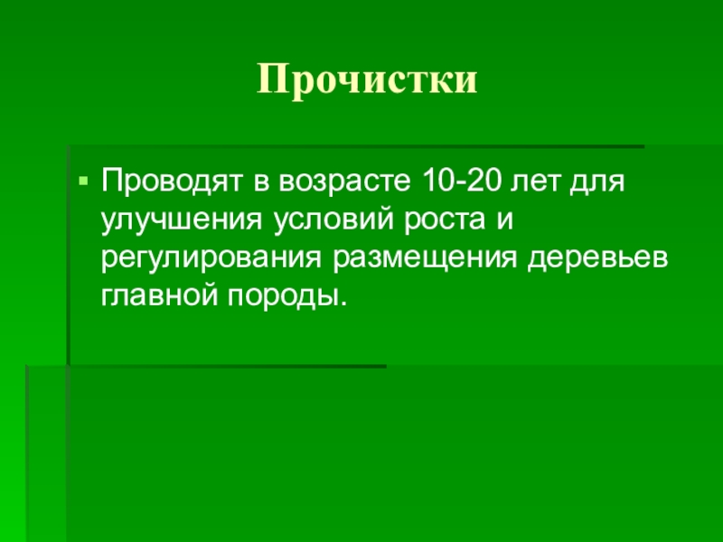 Проводят в приспевающих древостоях. Удаляют отставшие в росте деревья.