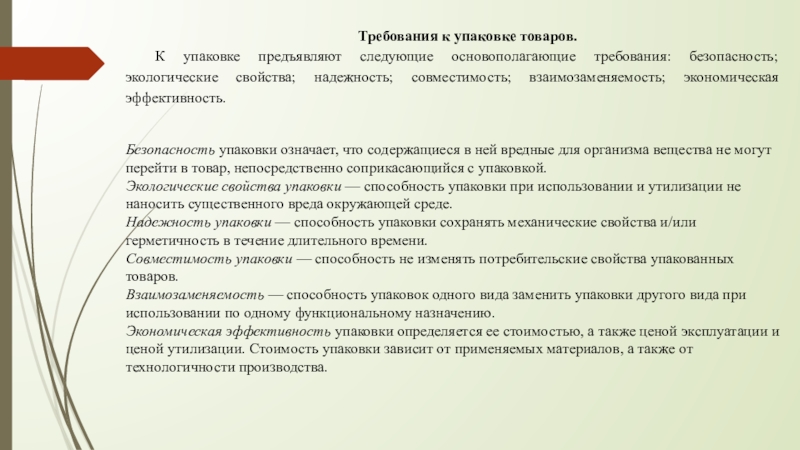Безопасность упаковки означает, что содержащиеся в ней вредные для организма вещества не могут перейти в товар, непосредственно соприкасающийся с упаковкой.