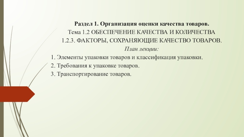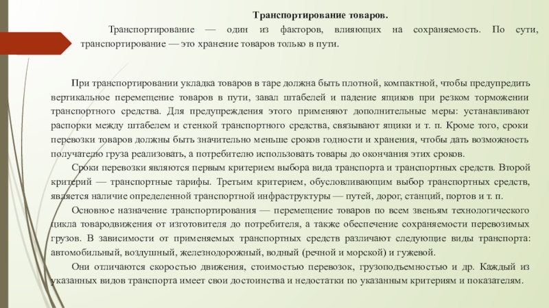 При транспортировании укладка товаров в таре должна быть плотной, компактной, чтобы предупредить вертикальное перемещение товаров в пути, завал штабелей и падение ящиков при резком торможении транспортного средства. Для предупреждения этого применяют дополнительные меры: устанавливают распорки между штабелем и стенкой транспортного средства, связывают ящики и т. п. Кроме того, сроки перевозки товаров должны быть значительно меньше сроков годности и хранения, чтобы дать возможность получателю груза реализовать, а потребителю использовать товары до окончания этих сроков.