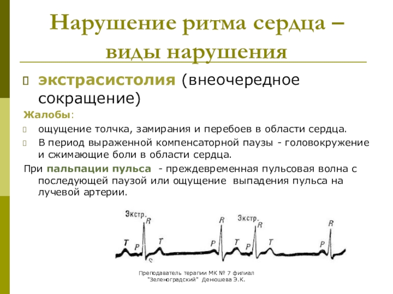 При пальпации пульса - преждевременная пульсовая волна с последующей паузой или ощущение выпадения пульса на лучевой артерии.