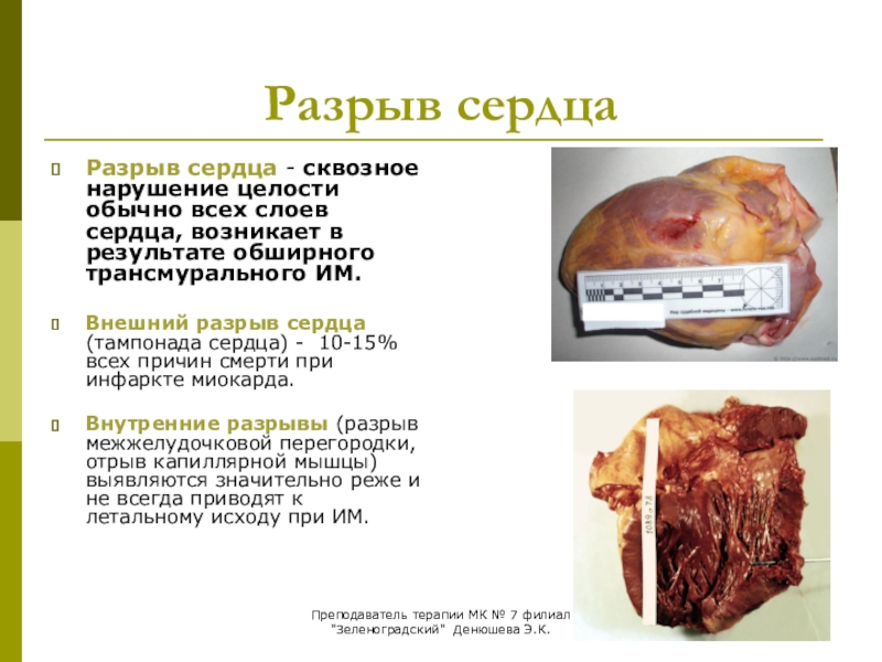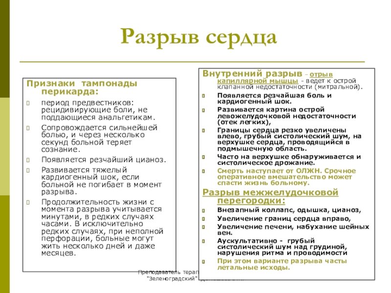 Внутренний разрыв – отрыв капиллярной мышцы - ведет к острой клапанной недостаточности (митральной).