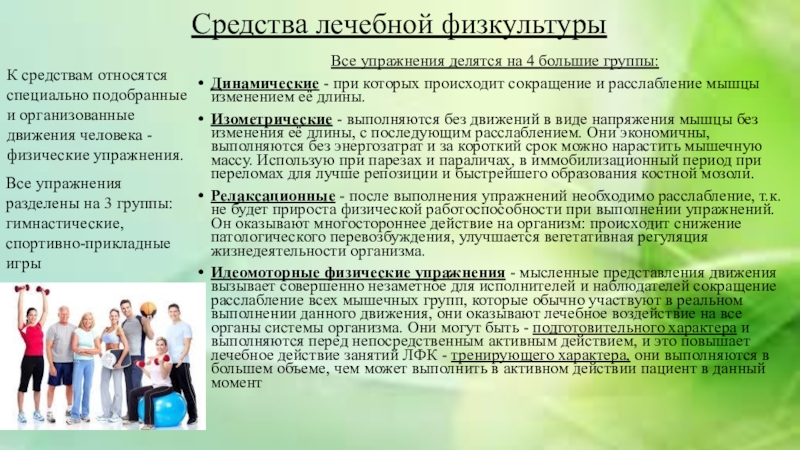 Динамические - при которых происходит сокращение и расслабление мышцы изменением её длины.