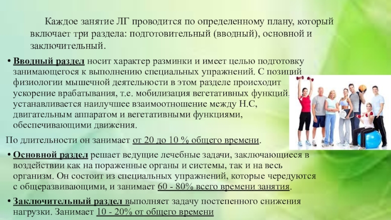 Основной раздел решает ведущие лечебные задачи, заключающиеся в воздействии как на пораженные органы и системы, так и на весь организм. Он состоит из специальных упражнений, которые чередуются с общеразвивающими, и занимает 60 - 80% всего времени занятия.