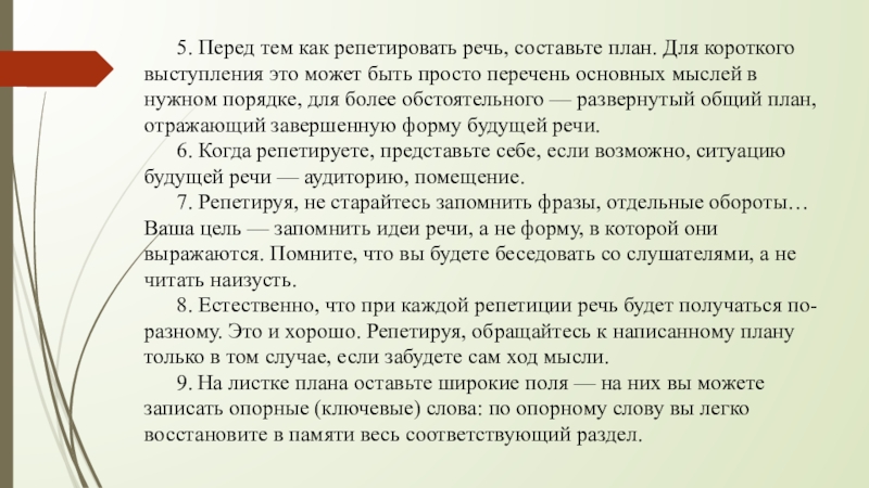 Слайд 4 5. Перед тем как репетировать речь, составьте план. Для короткого выступления